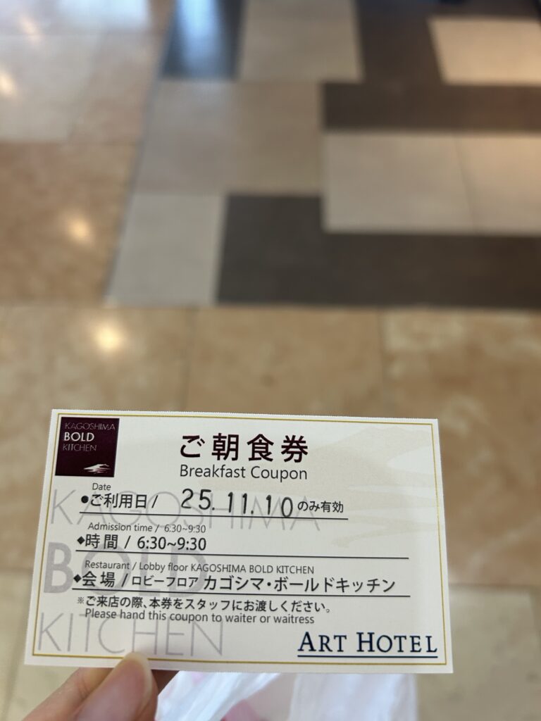 今回自分は宿泊予約時に朝食付きのプランにしていたので、チェックインの際こちらの朝食券がもらえました。