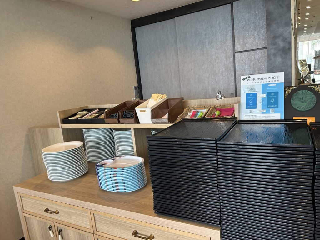 入り口でお皿などを取ってビュッフェに向かいましょう!