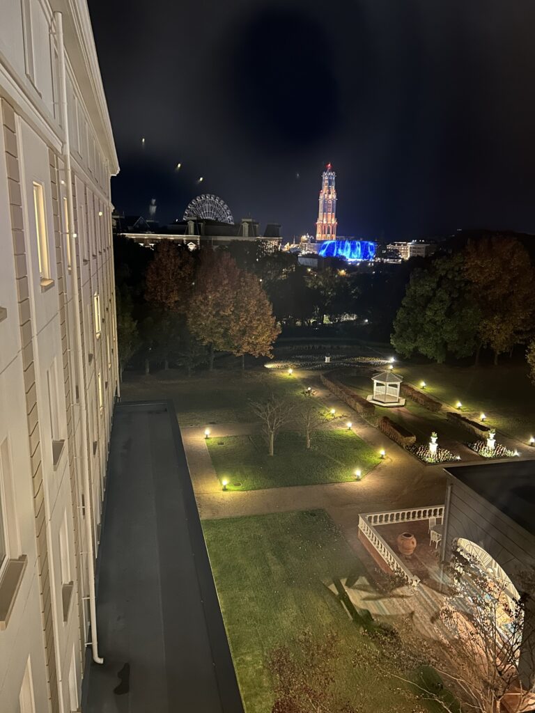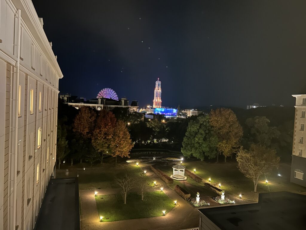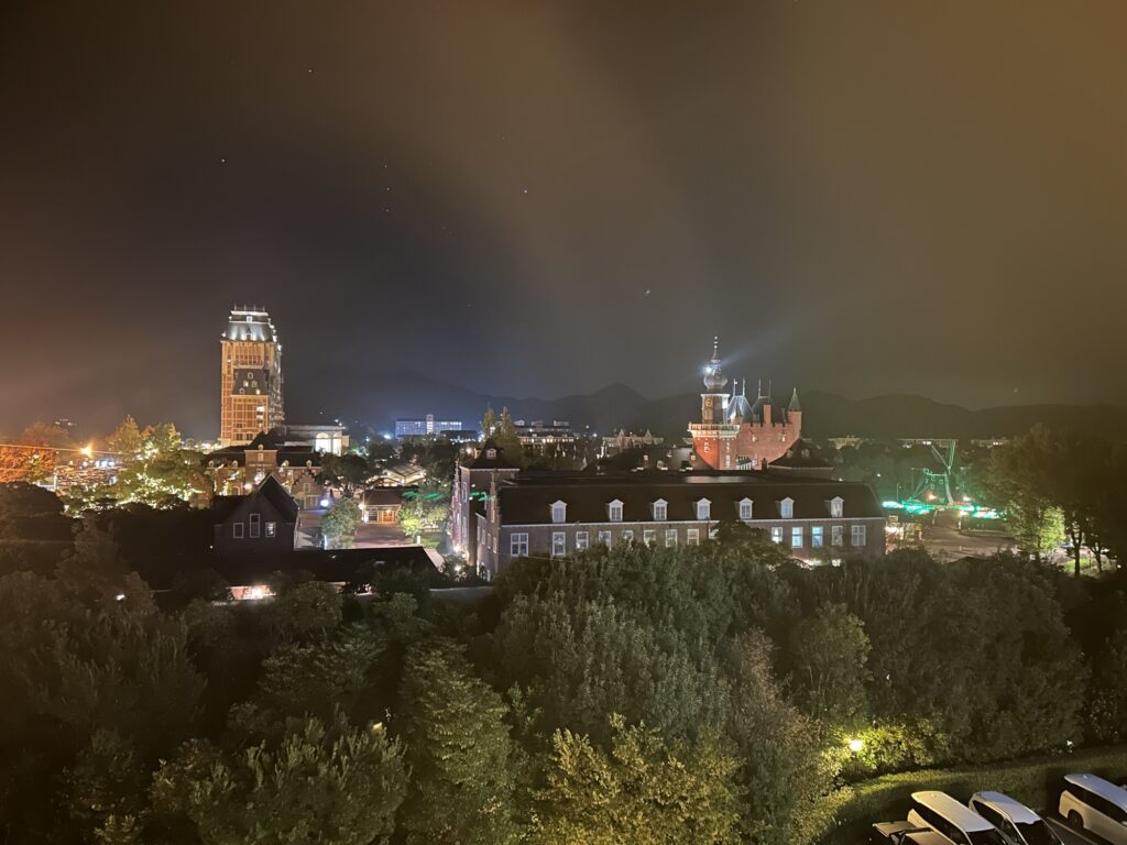 上の2枚は自分が宿泊したパークサイド側の部屋からのもの。実は予約時に、パークサイド側の部屋を予約すればハウステンボスは見れるかを確認したところ、部屋の位置によるとのことでした。たまたま運が良かったのかもしれませんが、もし部屋から見えなくても大丈夫。共用のエレベーターホールからでもばっちり見えますよ!