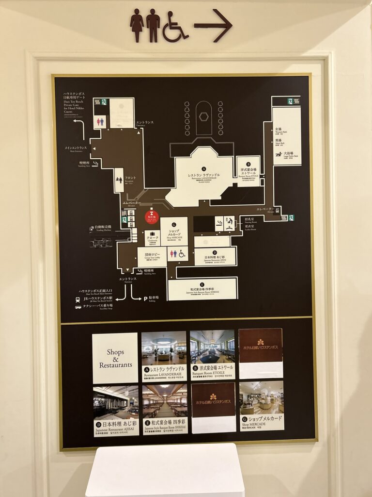 客室は2-6階。フロント、大浴場、売店、レストランなど必要なものは全て1階に集結しています。