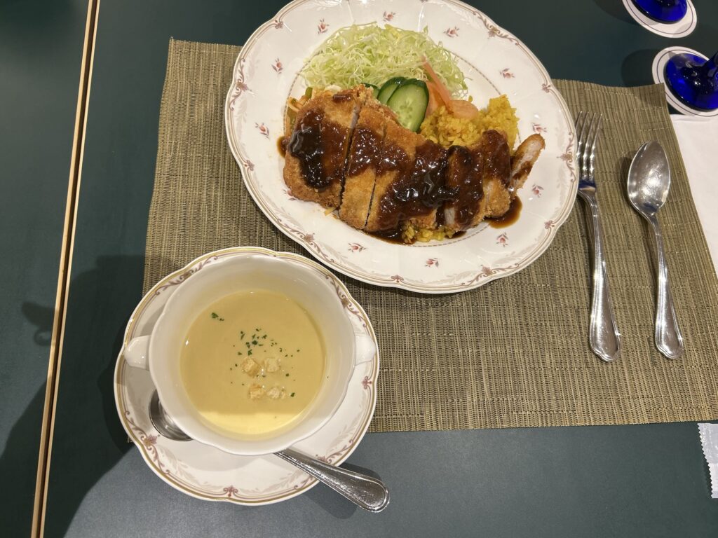 トルコライス、コーンスープ。カツはサクサク、スパゲッティもおいしかったのですが、中でもライスがかなり良かったです!独特の香辛料で炒められたライスをカツと一緒に食べるのはたまらないおいしさ!あっという間の完食でした。
