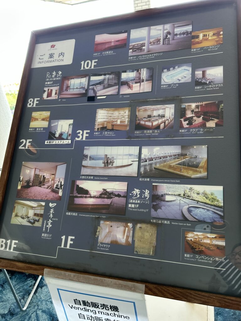 案内板はなかなか歴史を感じるものでしたが、見ての通り利用できる施設が盛りだくさん。特に露天風呂はかなり見晴らしもよくとても素敵でしたよ!