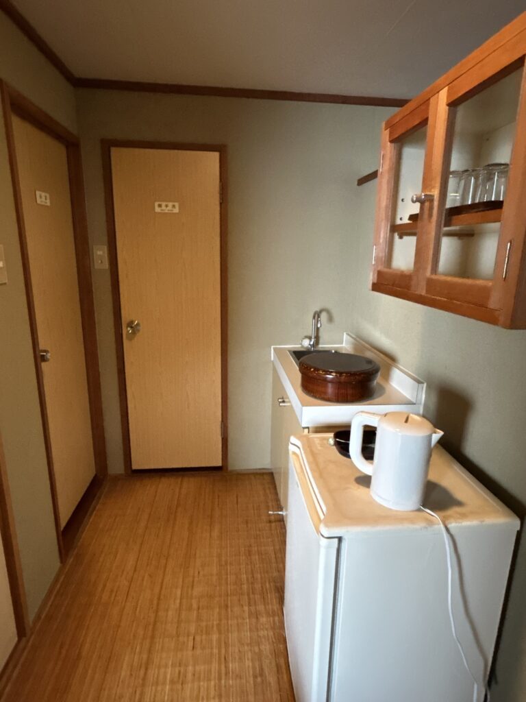 手洗い場や冷蔵庫はこちら。なにやらカップボードもありました。