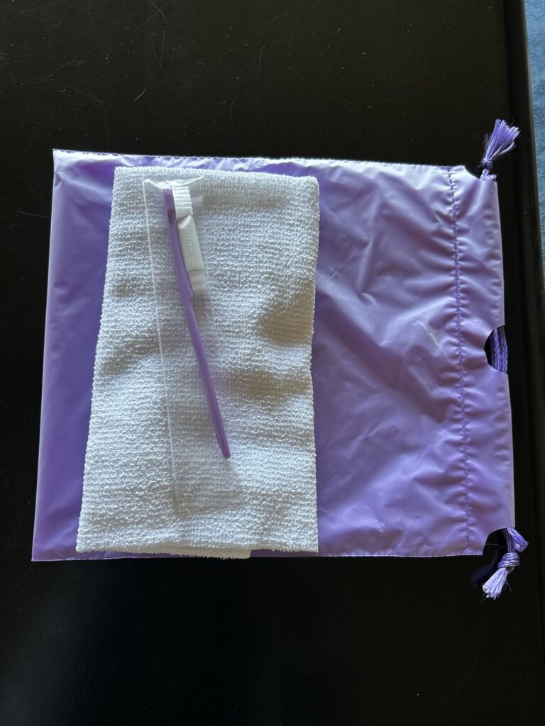 一瞬見落としがちですが、小さめタオルと歯ブラシはビニールの袋の中に入ってます。