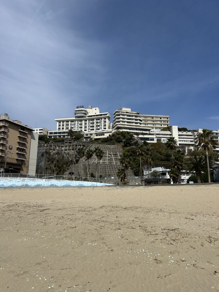 海を見ながらふと後ろを見るとホテル東海園が上の方に見えました…あそこまでまた戻るのか…