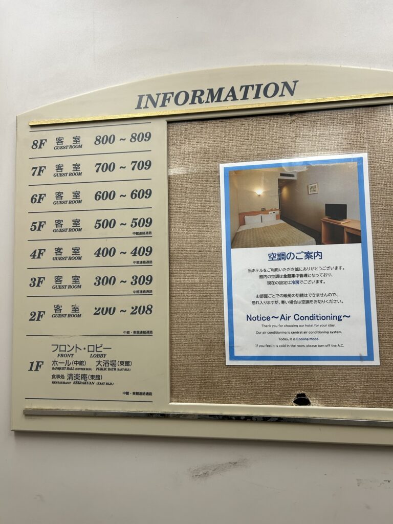 ちなみにホテル一楽は全館空調システムを導入しているようで各部屋に通常のエアコンはついていません。そのため秋頃でもまだ冷房が使用されてることも。少し寒い時はフロントで毛布を借りましょう。