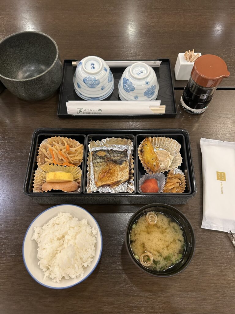 朝食はお弁当形式。魚や様々な副菜がありました。福岡の名物、明太子も出てくるのが嬉しいです。