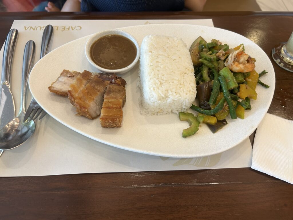 豚肉プレート。こちらも395ペソ。同じ野菜炒めがついてきます。豚肉はチキンより少し柔らかめで、どちらもおいしかったですが個人的には豚肉の方が好きでした。