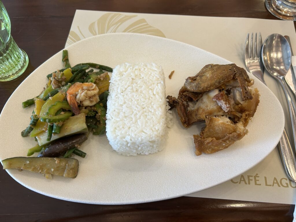 チキンのプレート395ペソ。パリパリのチキンとゴーヤの入った野菜炒め、一緒に食べるとご飯がかなり進みました!野菜炒めは魚の出汁のようなもので炒めてるのか独特の香りがしましたが、クセになる美味しさでしたよ。