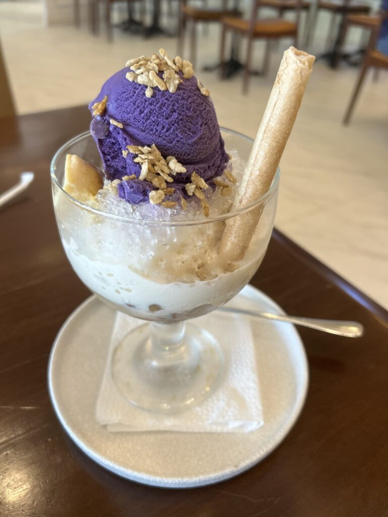 ハロハロ250ペソ。ウベアイスの下にはかき氷、奥の方には豆やフルーツなどが入ってました。全体的にココナッツミルクがかかった甘さがたまらなく、何杯でも食べられるおいしさでした。