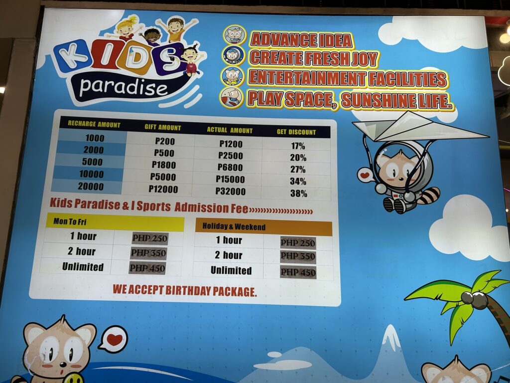 金額は週末(土日)と平日で料金が分かれており、例えば平日の2時間は330ペソです。